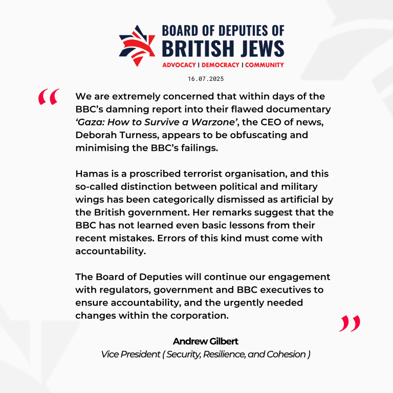 “The Board of Deputies will continue our engagement with regulators, government and BBC executives to ensure accountability, and the urgently needed changes within the corporation.”