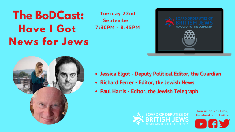 Our latest BoDCast takes place on Tuesday September 22 at 7.30pm when The Guardian’s Deputy Political Editor Jessica Elgot, Jewish News Editor Richard Ferrer and Jewish Telegraph Editor Paul Harris get together to discuss how the media deals with Jewish issues. It should be a lively debate. No registration needed. The webinar will be livestreamed on our Facebook page, YouTube channel and on the Board of Deputies website
