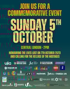 As we approach two years since the horrific events of 7th October, 2023, when Hamas terrorists infiltrated Israel, murdering 1,200 innocent men, women, and children and taking 251 people hostage, we invite you to join us in remembrance. Please join us for a commemorative event to honour the lives lost and affected on 7th October 2023 and to call for the release of the 48 still held in captivity.